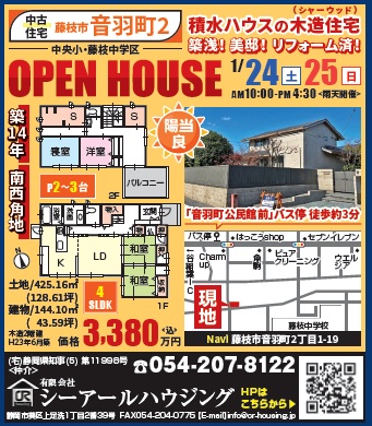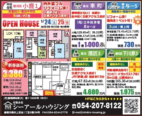 ** OPEN HOUSE 駿河区小鹿1丁目・藤枝市音羽町2丁目 **By CR HOUSING / 2026年1月23日 令和8年1月24日(土)・1月25日(日) AM10:00~PM4:30 雨天開催 ■ 駿河区小鹿1丁目 中古住宅 3,380万円(税込) ■ 藤枝市音羽町2丁目 中古住宅 3,380万円